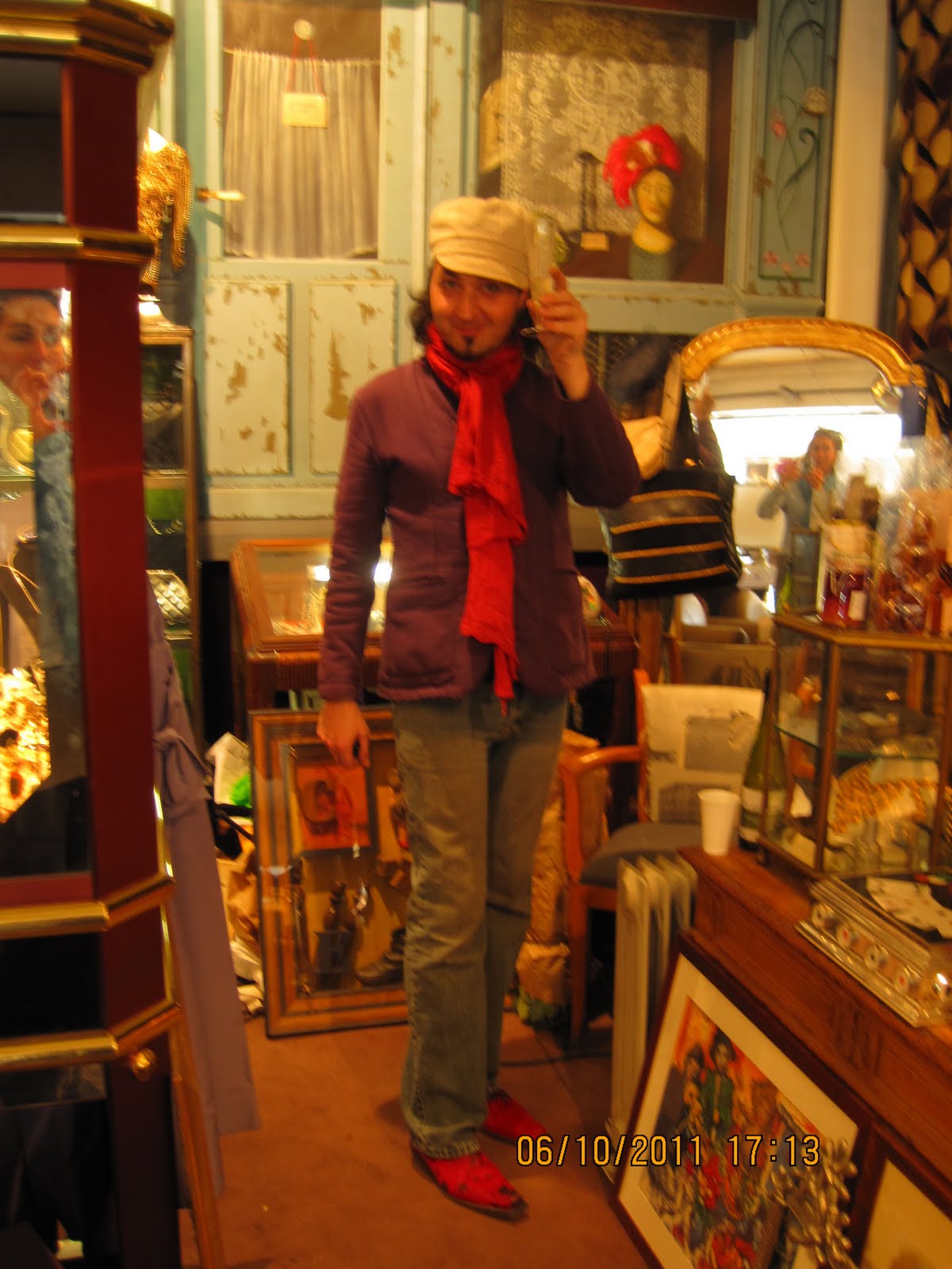 Judy, Lynn, Theresa and I then shopped the consignment stores and flea market while I purchased two pairs of earrings for 5 Euros. Bargain right? Additionally, I met the fabulous Lawrence while shopping at the flea market. I've purchased many a things from the Paris flea market but never came across the likes of Lawrence. His boots were made of red Pony fur (from Italy according to Lawrence); his jacket was purple and he sipped champagne and offered me some while we looked at Channel and other notable items. He was a true gentleman while wearing my favorite color combinations (see Lawrence below).